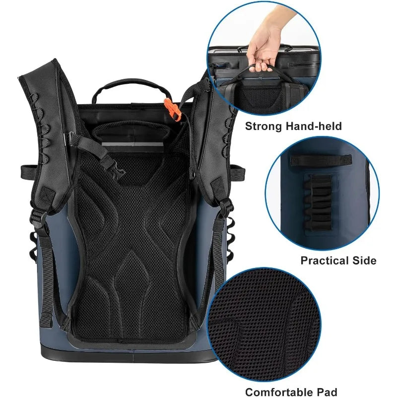 - SUPER LONG COOLING PERFORMANCE: More than 48 hours extra long cooling insulation time under a 107 degree indoor environment. Lining is composed of 28mm thick high-density insulation foam and TPU waterproof film. Outer layer is composed of densified Oxford cloth, more durable. 4 unique material support up to 48h--32°F cold holding, provide backpack cooler bag a superior cooling protection effect.
