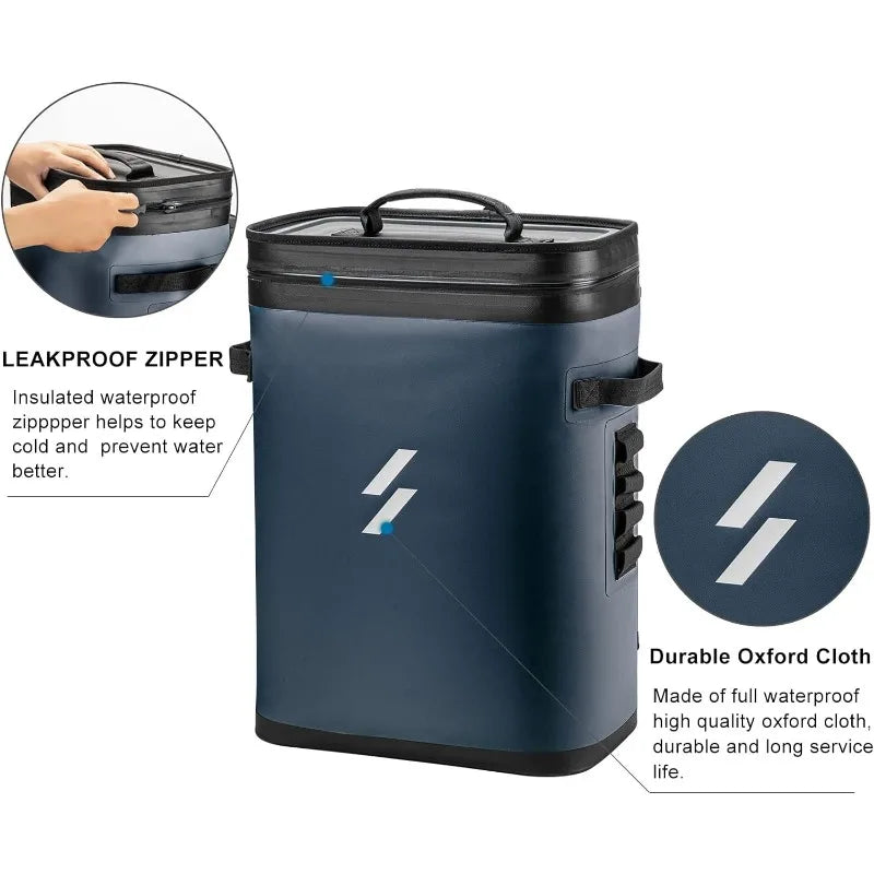 - LEAKPROOF & WATERPROOF: ROCKBROS Insulated backpack cooler bags are made of double-sided waterproof material and leak-proof zipper to effectively minimizes loss of cool air. The soft side cooler bag filled with drinks&fruit is durable and strong enough. 100% waterproof material and perfect sealing feature ensure soft sided cooler excellent performance.(Attention: For better leak-proof performance, we strengthened zipper that would be a little bit to zipped. Please use the zipper lubricant.)